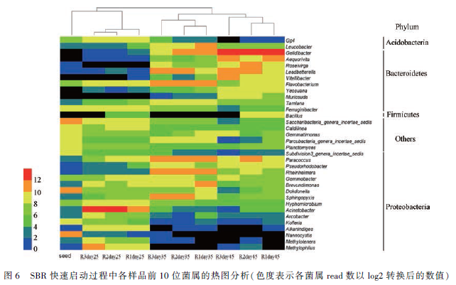 4 組實驗的微生物群落結構熱圖和主成分分析是基于各樣品中含量前10 位菌屬共計34 種菌屬(如圖6 和7 所示)。根據主成分分析的聚類結果,可以將R1 和R2 的啟動分為3 個階段,這與反應器運行的狀況相吻合。階段(1 ~ 15 d),反應器中活性污泥還處于適應期,進水為普通生活污水,主要以變形菌門中,如不動桿菌屬(Acinetobacter)、布蘭漢氏菌屬(Alkanindiges)、嗜門菌屬(Methylophius)和生絲微菌屬(Hyphomicroblum)等占優(yōu)勢;第二階段(15 ~ 25 d),開始以高鹽廢水為進水,此時鹽度的沖擊負荷使得微生物群落結構反生改變,變形菌門中的微生物豐度進一步增加,并達到較大豐度;第三階段(25 ~ 45 d),經過一段時間的運行和馴化,擬桿菌門中,如鳥桿菌屬(Gelidibacter)、黃桿菌屬(Flavobacterium)、碳酸噬胞菌屬(Aequorivita)等逐漸成為優(yōu)勢種屬,而變形菌門中的微生物豐度下降。有趣的是,由于復合菌劑和菌填料的投加,第二階段芽孢桿菌屬(Bacillus) 的豐度上升,并在之后的運行中逐漸成為優(yōu)勢種屬,而這一階段R1 與R2 對TOC 的去除率也遠高于R3,因此,復合菌劑的投加對改善生物工藝有機物去除效果,縮短啟動時間具有顯著的效果。