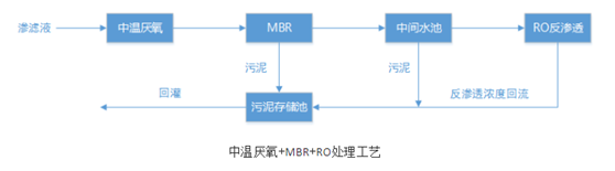 滲濾液通過(guò)調(diào)節(jié)池流入到中溫厭氧池,經(jīng)大分子有機(jī)污染物降解后進(jìn)入缺氧段MBR反應(yīng)器中,與回流水混合進(jìn)入好氧段MBR進(jìn)行曝氣,去除滲濾液中的TN,好氧池出水進(jìn)入MBR分離器,將分離的污泥濃液回流至MBR缺氧段,MBR出水進(jìn)入反滲透系統(tǒng),滲濾液經(jīng)反滲透處理后實(shí)現(xiàn)達(dá)標(biāo)排放。